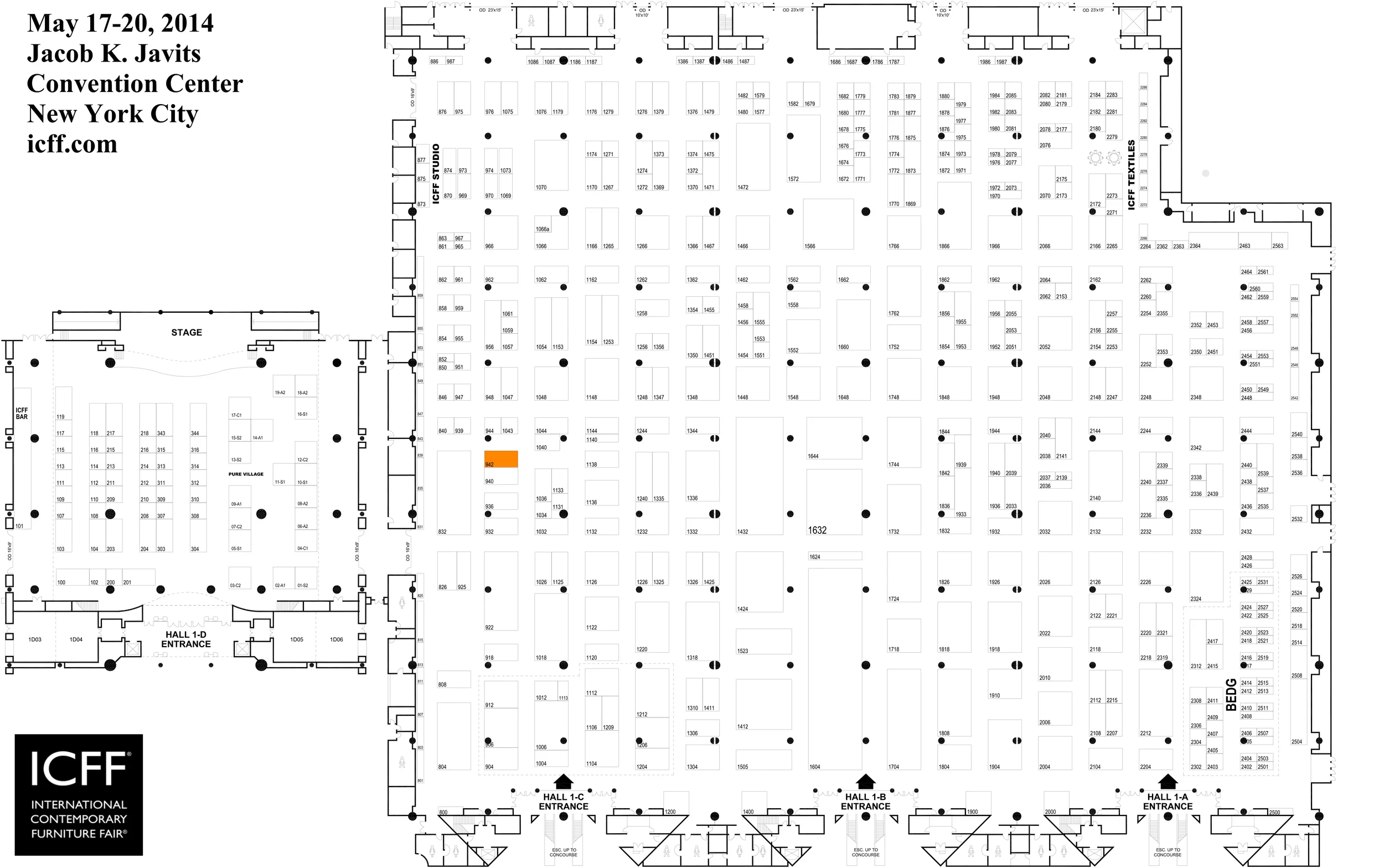 2014 ICFF International Contemporary Furniture Fair Saturday, May 17, 2014 10:00 AM 10:00 Tuesday, May 20, 2014 4:00 PM 16:00 Jacob K. Javits Convention Center 655 W 34th St New York, NY 10001 USA (map) Google Calendar ICS View fullsize Booth 942